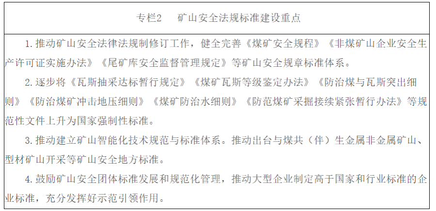 2.加強(qiáng)礦山安全標(biāo)準(zhǔn)建設(shè)。堅持和鞏固政府引導(dǎo)、社會參與、市場驅(qū)動、協(xié)同推進(jìn)的標(biāo)準(zhǔn)化工作格局。組建全國礦山安全標(biāo)準(zhǔn)化技術(shù)委員會,申請新增礦山安全行業(yè)標(biāo)準(zhǔn)代號(KA),將煤礦和非煤礦山安全生產(chǎn)行業(yè)標(biāo)準(zhǔn)科學(xué)分類優(yōu)化整合為礦山安全行業(yè)標(biāo)準(zhǔn)。完善礦山安全標(biāo)準(zhǔn)制修訂工作機(jī)制,強(qiáng)化智能化裝備、災(zāi)害防治、裝備安全技術(shù)條件等急需短缺標(biāo)準(zhǔn)制修訂,增加標(biāo)準(zhǔn)有效供給。鼓勵社會力量廣泛參與開展標(biāo)準(zhǔn)規(guī)范的制修訂工作。及時公開國家、行業(yè)、地方標(biāo)準(zhǔn),強(qiáng)化標(biāo)準(zhǔn)宣貫培訓(xùn)和實施評估,充分發(fā)揮標(biāo)準(zhǔn)對礦山企業(yè)現(xiàn)場安全管理和安全監(jiān)管監(jiān)察執(zhí)法的支撐作用。